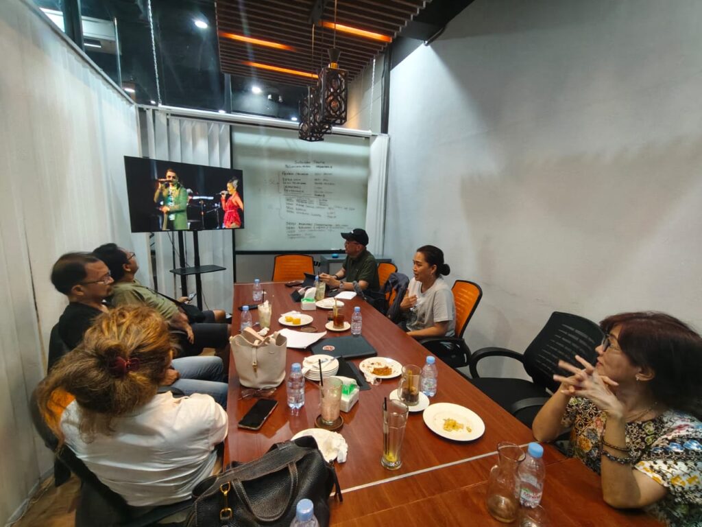 Di tengah meja, kopi dan kudapan ringan menemani pertukaran ide dari para profesional lintas disiplin: penata artistik, sutradara, produser, hingga penata tari dan musik. Layar TV di ujung ruangan menampilkan salah satu referensi penampilan panggung, memantik inspirasi sekaligus menjadi titik diskusi visual yang hangat.