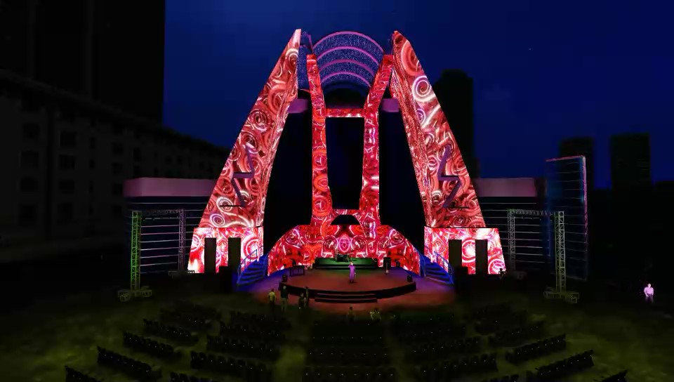 Pola batik digital yang menghiasi seluruh lengkungan struktur utama memantulkan warna-warna hangat dan bersemangat, seakan menghidupkan suasana dalam irama dan cerita yang akan dibawakan. Penataan tata suara, pencahayaan, serta layar LED raksasa memperkuat kesan imersif yang akan membawa penonton masuk ke dalam dunia musikal khas nusantara—keroncong.